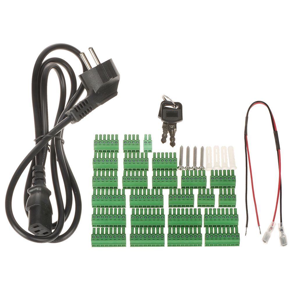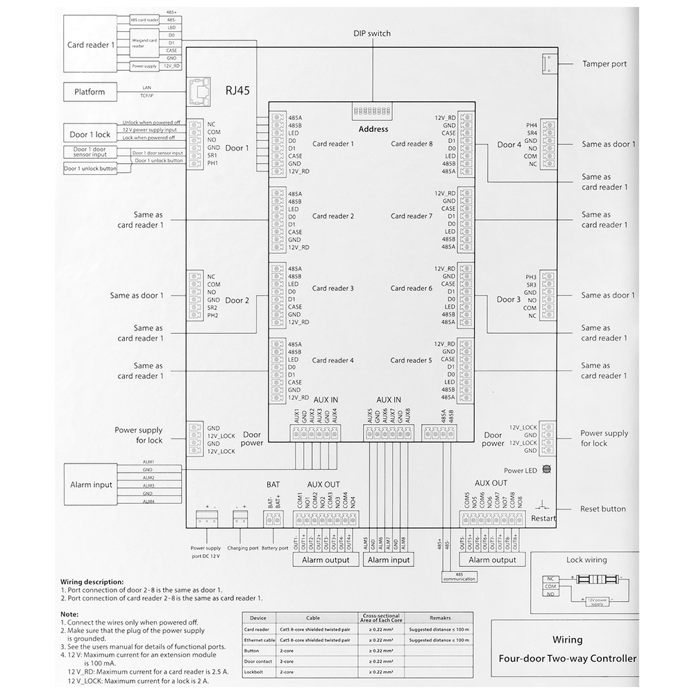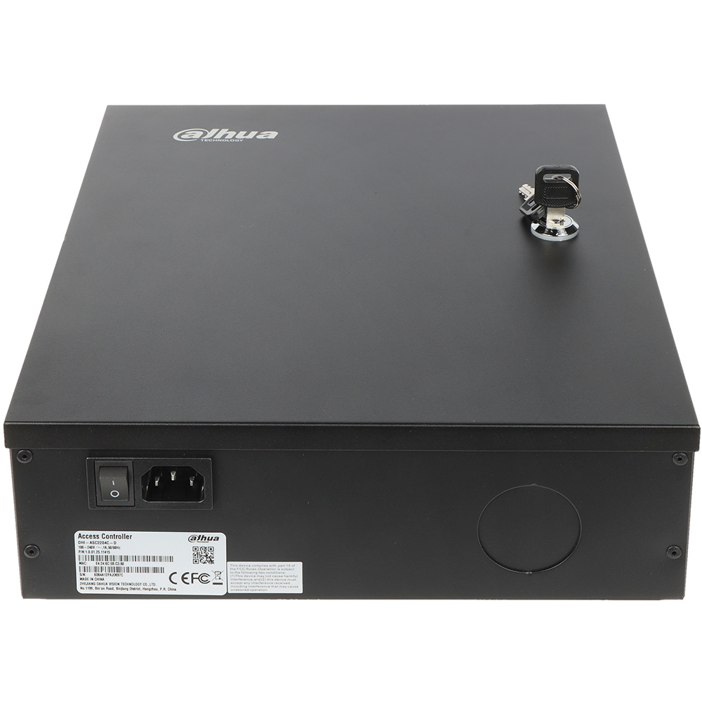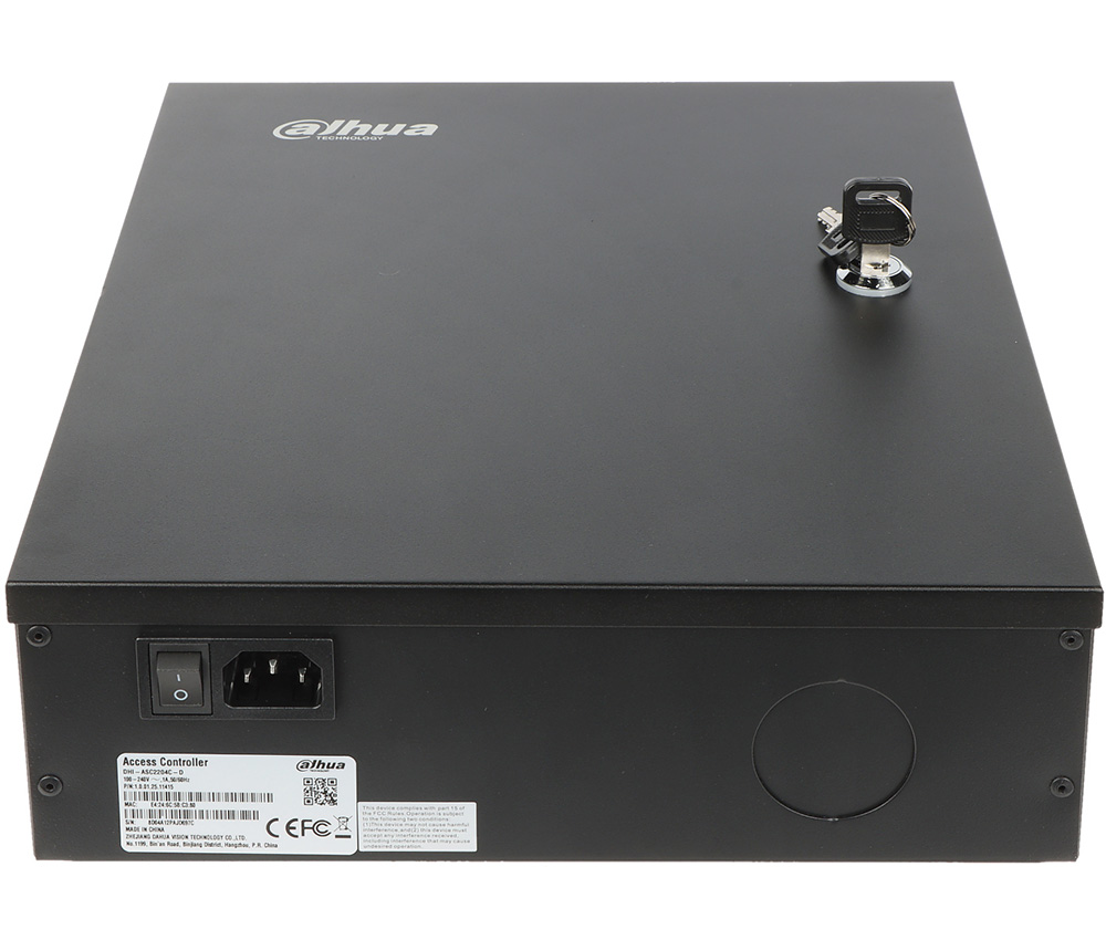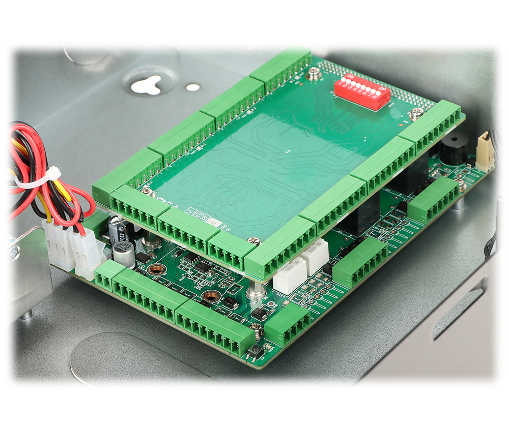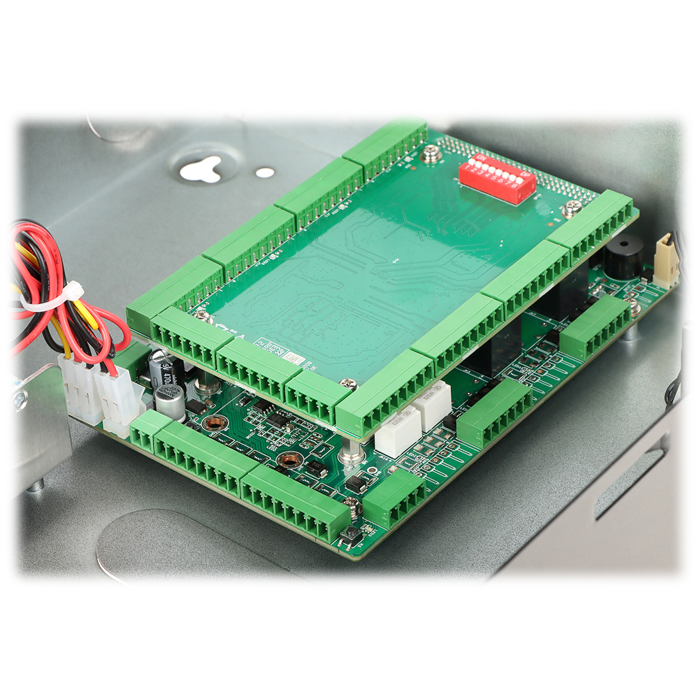 Mrežni kontroler za 4 čitača (4 vrata dvostrano) u metalnom kućištu sa napojnom jedinicom, punjačem i mestom za akumulator. Za RS485/Wiegand čitače. Integrisan CPU. 9 RS485 portova, 8 Wiegand porta, 8 digitalna alarmna ulaza, 8 alarmna izlaza (relej), 4 REX ulaza, 4 ulaza za status vrata, 4 izlaza za kontrolu brava. Podržava do 100,000 korisnika, 100,000 kartica, 3,000 otisaka prstiju. Memorija 500,000 događaja. Do 128 vremenskih rasporeda. Remote Verification i Blocklist/Allowlist podrška. Alarm – Anti-passback, Tamper, Duress, Door unlock timeout, Intrusion, Illegal card exceeding threshold, Duress fingerprint. Bazer. Ugrađen RTC. Podrška za ručnu i automatsku sinhronizaciju vremena. OSDP Protokol. SDK i API. IPv4, TCP, UDP. RJ45(10/100M) i RS485 interfejs. IP20 i IK04 stepen zaštite. Radna temperatura -30°C-+60°C. Dimenzije 337 mm × 272 mm × 90 mm. Masa 3.5kg. Potrebno napajanje 220VAC. Sa mestom i punjačem za aku. bateriju. Nazidna montaža. CE, FCC, UL.