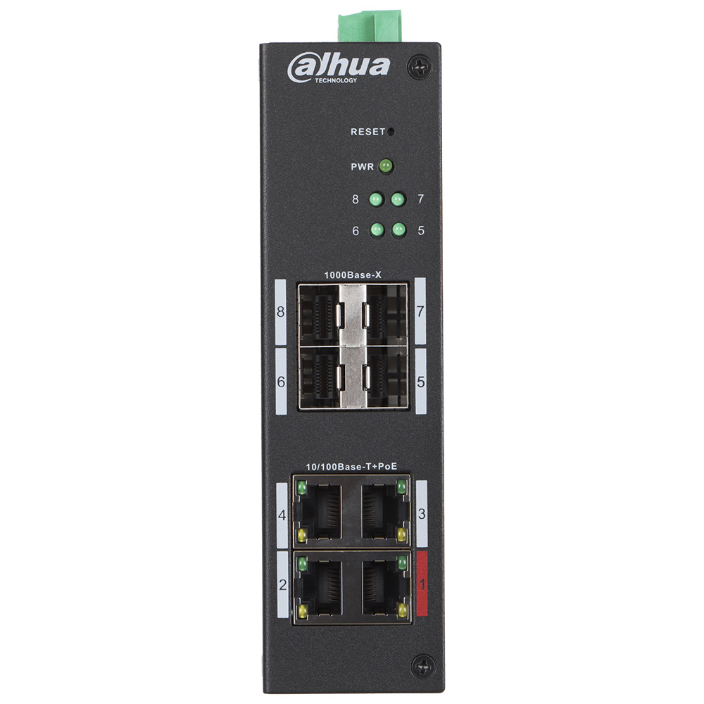Upravljivi Layer 2 industrijski PoE 8-portni switch sa 4 PoE porta i 4 SFP porta. 4x 10/100 (PoE). 4x 1000 (SFP). PoE budžet 96W. Do 90W na portu 1. Do 30W na portovima 2-4 U skladu sa IEEE802.3af, IEEE802.3at i Hi-PoE/IEEE 802.3bt. Podržava PoE Power Management. Intelligent PoE. PoE watchdog. Spanning tree protocol (STP/RSTP/ERPS). Podržava Long distance PoE. IPv4 routing 1. Link aggregation. IEEE 802.3x Flow Control. Multicast IGMP snooping. DHCP client. SNMPv1/v2/v3. Switching Capacity 8.8G. Packet Forwarding Rate 6.5472 Mpps. Packet bufer size 4.1 Mbit. MAC table 8K. Broj VLAN-ova 4094. Broj VLAN interfejsa 10. Komunikacioni standardi IEEE802.3, IEEE802.3u, IEEE802.3x, IEEE802.3ab, IEEE802.3az. EMC zaštita. Napajačka jedinica 220VAc/53VDc. Zaštita od atmosferskog pražnjenja 8kV, Zaštita od kontaktnog pražnjenja 6kV. Zaštita od udara groma Common mode 4kV, Differential mode 2kV. Podržava opciono redundatno napajanje. Radna temperatura -30°C~65°C. Dimenzije 152.9mm × 110.4mm × 42.0mm. Masa 540g.