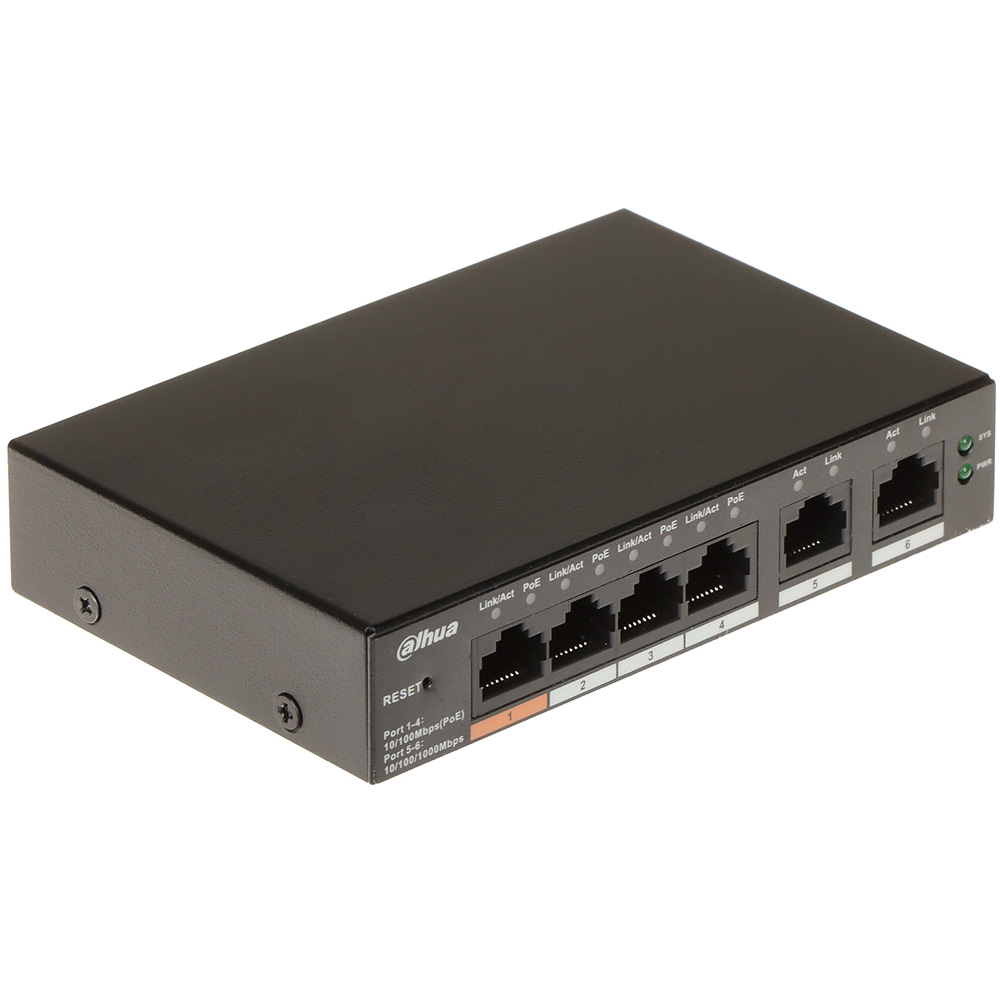 1 kom Dahua CS4006-4ET-60 – Cloud upravljivi Layer 2 PoE 4-portni switch sa 2 uplink-a. Port 1–4: 4 × RJ-45 10/100Mbps (PoE). Port 5-6: 2 × RJ-45 10/100/1000 Mbps (Uplink). PoE budžet 60W. Do 60W po portu maksimalno (Port 1). Do 30W portovi 2-4. Switching Capacity 4.8Gbps. Packet Forwarding Rate 3.57Mpps. Veličina bafera za pakete: 4 Mbit. Jumbo frame: 9216 Byte. Veličina MAC tabele: 8K. Broj VLAN-ova: 32. Menadžment PoE potrošnje / Inteligentni PoE. Loop zaštita. Menadžment mrežne topologije – sa podrškom LLDP protokol. Komunikacioni standardi: IEEE802.3, IEEE802.3u, IEEE802.3x, IEEE802.3ab. PoE protokoli IEEE802.3af, IEEE802.3at, Hi-PoE. PoE watchdog. VLAN port based. DHCP klijent. Podržava Long distance PoE. Taster za reset. MTBF 232.62 godine. App Management. Web management. Napajačka jedinica 220VAc/53VDc, 1.226A. Zaštita od električnog pražnjenja: 6kV. Zaštita od atmosferskog pražnjenja: 8 kV. Zaštita od udara groma: Common mode: 4 kV, Differential mode: 2 kV. EMC zaštita. Radna temperatura -10°C~55°C. Dimenzije 130mm ×90mm ×26mm. Masa 280g. Kućište od metala. U pakovanju sa napojnim adapterom. Montaža na radnu površinu ili na zid.
