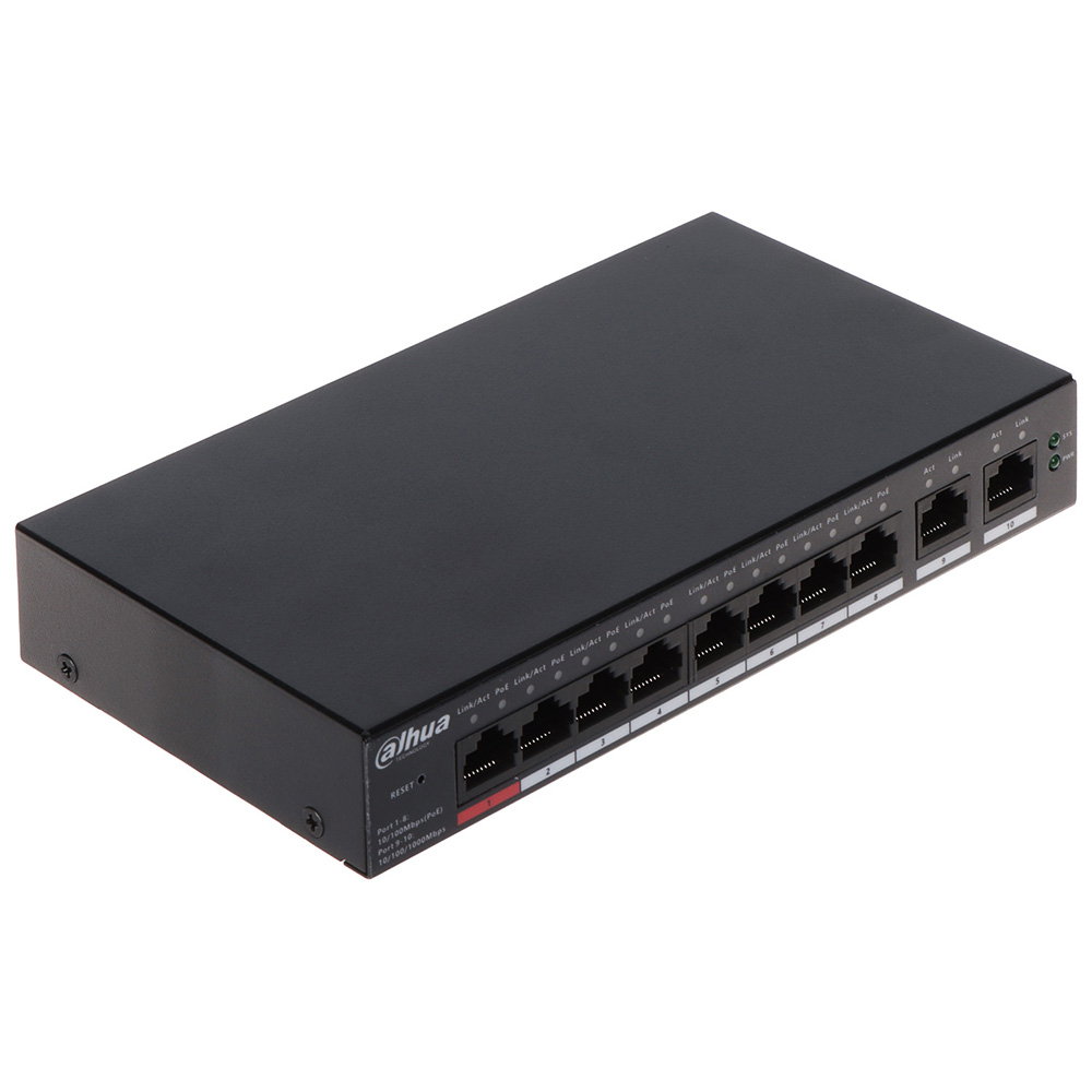 1 kom Dahua CS4010-8ET-110 – Cloud upravljivi Layer 2 PoE 8-portni switch sa 2 uplink-a. Port 1–8: 8 × RJ-45 10/100 Mbps (PoE). Port 9-10: 2 × RJ-45 10/100/1000 Mbps (Uplink). PoE budžet 110W. Do 90W po portu maksimalno (Port 1). Do 30W portovi 2-8. Switching Capacity 5.6Gbps. Packet Forwarding Rate 4.17Mpps. Veličina bafera za pakete: 4 Mbit. Jumbo frame: 9216 Byte. Veličina MAC tabele: 8K. Broj VLAN-ova: 32. Menadžment PoE potrošnje / Inteligentni PoE. Loop zaštita. Menadžment mrežne topologije – sa podrškom LLDP protokol. Spanning tree protokoli: STP/RSTP. Komunikacioni standardi: IEEE802.3, IEEE802.3u, IEEE802.3x, IEEE802.3ab. PoE protokoli IEEE802.3af, IEEE802.3at, IEEE802.3bt, Hi-PoE. IEEE 802.3x Flow Control. PoE watchdog. VLAN port based. DHCP klijent. Podržava Long distance PoE. Taster za reset. MTBF 150 godina. App Management. Web management. Napajačka jedinica 220VAc/54VDc, 2.22A. Zaštita od električnog pražnjenja: 6kV. Zaštita od atmosferskog pražnjenja: 8 kV. Zaštita od udara groma: Common mode: 4 kV, Differential mode: 2 kV. EMC zaštita. Radna temperatura -10°C~55°C. Dimenzije 190 mm × 106 mm × 30 mm. Masa 500g. Kućište od metala. U pakovanju sa napojnim adapterom. Montaža na radnu površinu ili na zid. CE sertifikovan.