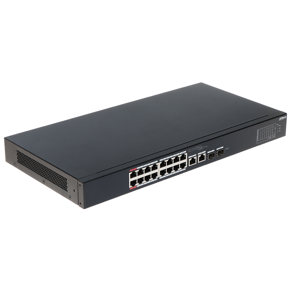 1 kom Dahua CS4218-16ET-135 – Port 1–16: 8 × RJ-45 10/100 Mbps (PoE). Port 17-18: 2 × RJ-45 10/100/1000 Mbps (Combo). 17-18: 2 × SFP 1000 Mbps (combo). Brzina optičkog uplink-a: 1 Gbps. PoE budžet 135W. Do 90W po portu maksimalno (Port 1). Do 30W portovi 3-16. Switching Capacity 7.2Gbps. Packet Forwarding Rate 5.36Mpps. Veličina bafera za pakete: 4 Mbit. Jumbo frame: 15K Byte. Veličina MAC tabele: 8K. Broj VLAN-ova: 32. Menadžment PoE potrošnje / Inteligentni PoE. Loop zaštita. Menadžment mrežne topologije – sa podrškom LLDP protokol. Spanning tree protokoli: STP/RSTP. Komunikacioni standardi: IEEE802.3, IEEE802.3u, IEEE802.3x, IEEE802.3ab, IEEE802.3z. PoE protokoli IEEE802.3af, IEEE802.3at, IEEE802.3bt, Hi-PoE. IEEE 802.3x Flow Control. PoE watchdog. VLAN port based. DHCP klijent. Podržava Long distance PoE. Taster za reset. MTBF 87.10 godina. App Management. Web management. Napajanje 220VAc, potrošnja max 154W. Zaštita od električnog pražnjenja: 6kV. Zaštita od atmosferskog pražnjenja: 8 kV. Zaštita od udara groma: Common mode: 4 kV, Differential mode: 2 kV. EMC zaštita. Radna temperatura -10°C~55°C. Dimenzije 440 mm × 220 mm × 44 mm. Masa 2.23kg. Kućište od metala. Montaža na radnu površinu ili rek.