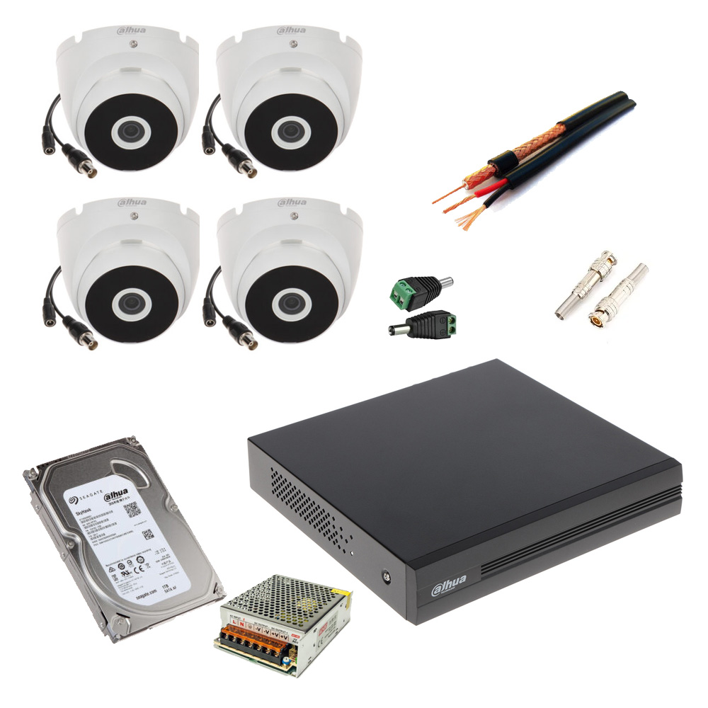 Komplet sadrži4 x DAHUA HAC-T2A21, 4u1 (analogna, HDCVI, AHD, TVI) 2MP dome IC kamera; 1/2.7” 2 Megapixela CMOS; Efektivni broj piksela 1920(H) x 1080(V); Rezolucija 1920×1080@25 fps ili 1280×720@25/50 fps; 3.6mm F1.85 fiksni objektiv; Vidni ugao 93°; Opciono 2.8mm ili 6mm (vidni ugao 103° ili 54.7°); Osetljivost 0.04Lux/F1.85, 0Lux (IC uključ.); True day/night (ICR); Smart IC LE diode dometa cca. 20m; DWDR; BLC; 2D DNR; OSD; Izbor moda rada putem UTC OSD kontrolera ili sa HCVR uređaja; Prenos signala koaksijalnim kablom 75Ω na dužinama do 500m; Dimenzije 69.8mm×69.8mm×157.6mm; Masa 250g; Alu. kućište; IP67 sertifikovana; Radna temperatura -40°C~+60°C; Napajanje 12VDc ±30%/2.7W; CE (EN55032, EN55024, EN50130-4).