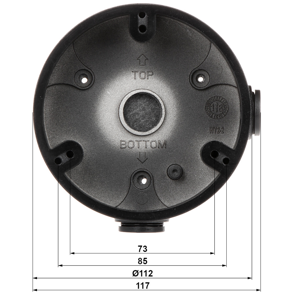Adapter za nazidnu montažu. Od aluminijuma. Masa 180g. Nosivost 1kg. Dimenzije φ 110mm x 34mm (V). Crne boje.