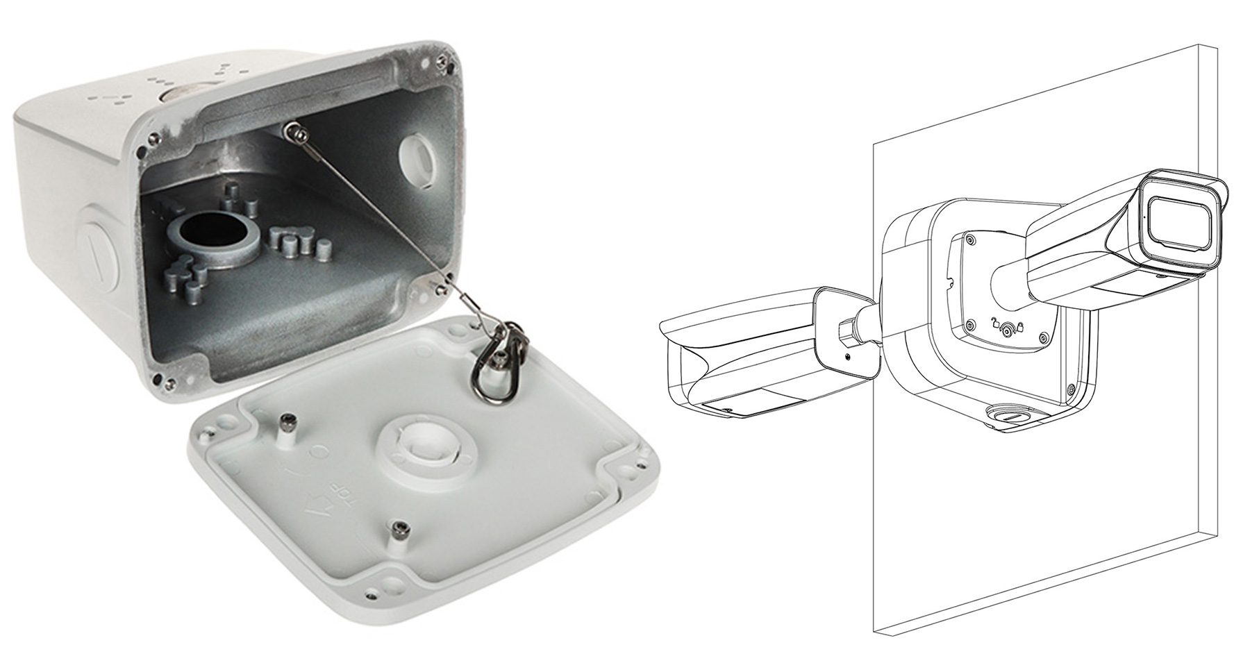 Nosač za zidnu montažu; Za dve kamere. Od aluminijuma. Masa 0,66kg. Nosivost 3kg. Dimenzije 173.0 mm × 133.9 mm × 143.8 mm. Mogućnost instalacije EOC, PoE ekstendera ili napojnog modula.