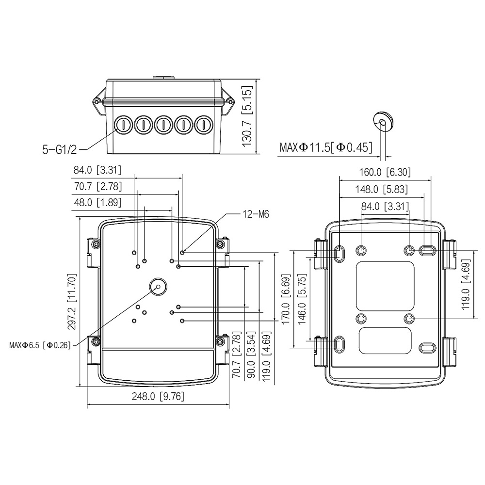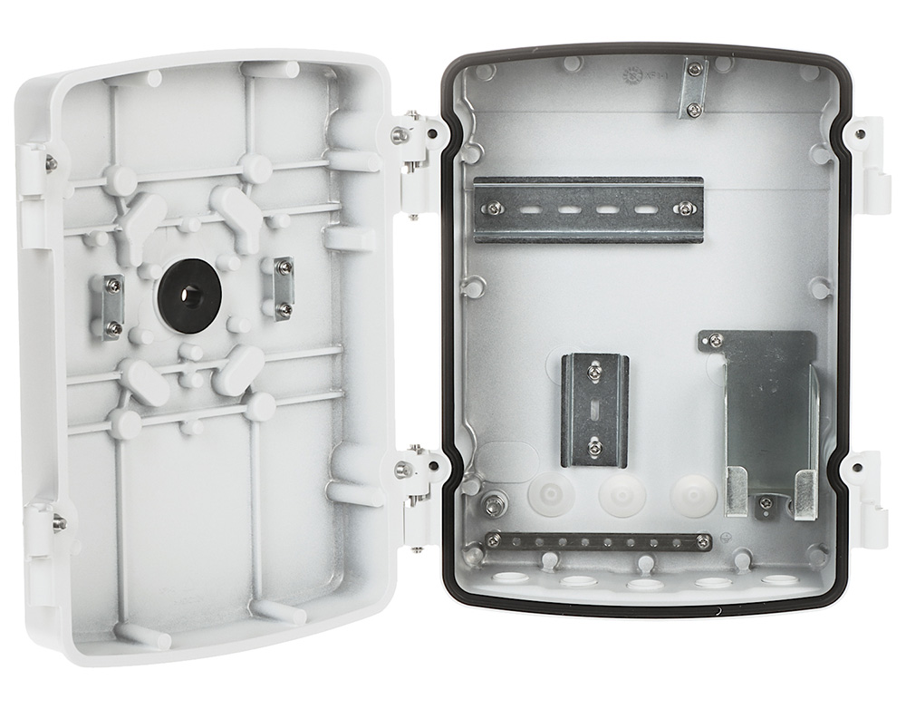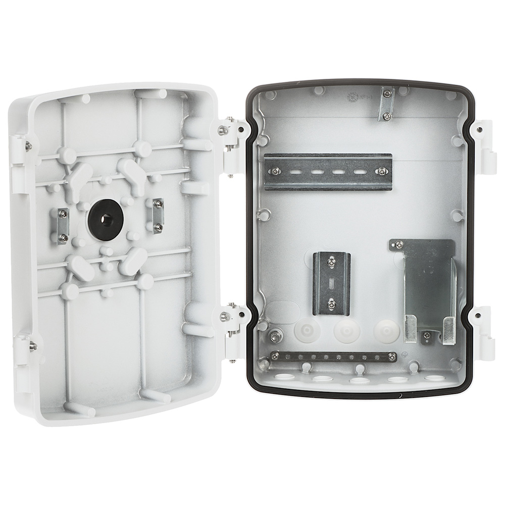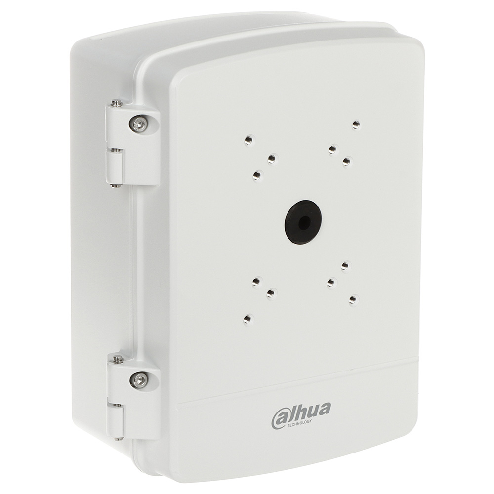 Kutija za smeštaj kablova, konektora i napojne jedinice, Pogodna za montažu dodatne opreme speed dome kamera i montažu same kamere na prednja vrata kućišta, Konstrukcija od livenog aluminijuma, Masa 3.38kg, nosivost do 8kg, Dimenzije 297.2mm × 248.0mm × 130.7mm, IP66 stepen zaštite, U kompletu sa kablovskim uvodnicama.