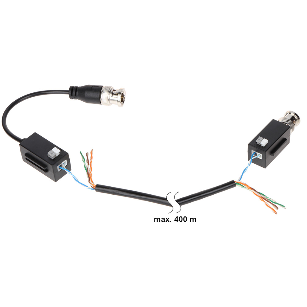 Pasivni primo-predajnik HDCVI signala po upredenoj parici; Model za 720P/1080P/4MP/5MP/4K rezolucije; Domet 400m za 720P, 250m za 1080P HDCVI signal i 200m za 4MP/5MP/4K HDCVI signal; Kompatibilan sa HDCVI/AHD/TVI/CVBS; Potiskivanje šuma (CMRR) od min. 60dB; Inkorporirna transientna zaštita; Sa ženskim BNC konektorom i „push“ terminalima; Cena je za par.
