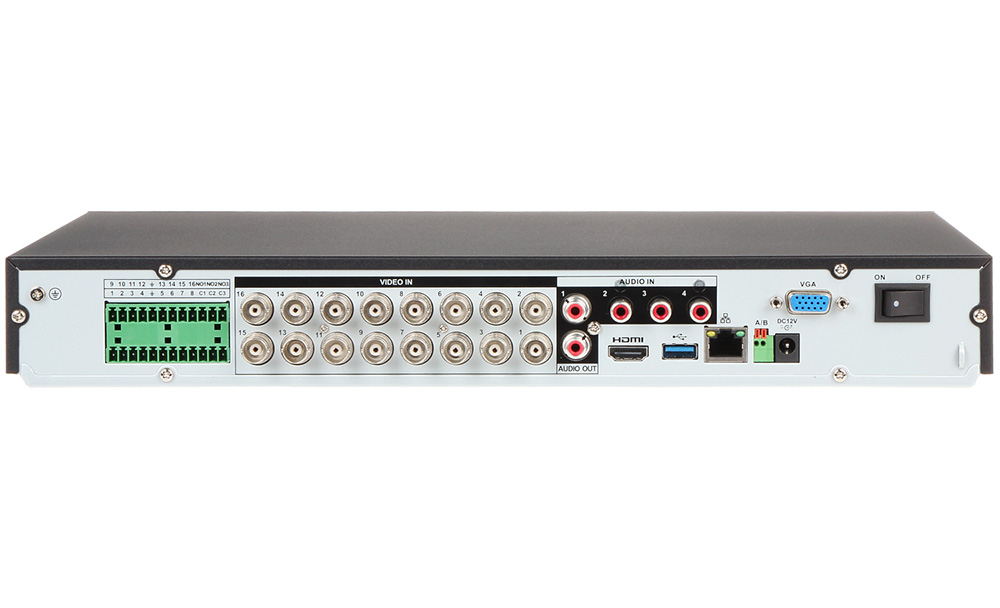 16+16 kanalni penta-brid, 112fps@4K, 160fps@6MP, 192fps@5MP, 240fps@4K-N/4 MP/3 MP, 400fps/4M-N/1080P/720P/960H/D1/CIF, metalno kućište, 4X audio ulaz/izlaz, 2X SATA, RS485, HDMI + VGA, 16 alarmnih ulaza/3 izlaza, network, WizSense analitika. 16+16 kanalni stand-alone penta-brid DVR (analog + HDCVI + AHD + TVI + IP). WizSenseserija. AI – zaštita perimetra (na do 2 kanalu, 10 pravila po kanalu – detekcija i pretraga po osobi/vozilu). AI – prepoznavanje lica – do 12 lica/kameri simultano na do dva kanala. Do 10 baza sa do 20.000 lica. SMD+ detekcija pokreta na do 16 kanala. AI Coding/H.265+/H.265/H.264+/H.264 video kompresija. G.711A, G.711U, PCM audio kompresija. 16 video ulaza. VGA izlaz. HDMI izlaz (do 4K). 4 audio ulaza/1 izlaz. USB x2 (USB 2.0 + USB 3.0 ) – za lokalni backup i miš. RS485. 16 alarmnih ulaza/3 izlaza. Rezolucija/frame rate za snimanje po kameri: 4K@(1-7 fps). 6MP@ (1-10 fps). 5MP@ (1-12 fps). 4K-N/4 MP/3 MP@ (1-15 fps). 4M-N/1080P/720P/960H/D1/CIF (1fps–25/30fps). Rezolucija prikaza 1280×720 ili do 3840×2160 (HDMI i VGA). Dual stream. 2 SATA porta – do 32TB. Network port 10/100/1000Mbps. CMS (DSS). Web pristup. Software za iOS i Android platforme. P2P podrška. Podržava do 16 dodatnih IP kamera (rezolucija do 8MP, ukupni bitrate do 128Mbps) ili do 32 IP kamere. Dimenzije 1U, 375.0mm × 289.4mm × 53.0mm (W×D×H). Masa 1.8kg. Napajanje 110-240VAc preko adaptera 12VDc 5A. POS. HDCVI audio i alarm. Broadcast audio. CE: CE-LVD: EN 60950-1/IEC 60950-1 CE-EMC: EN 61000-3-2, EN 61000-3-3, EN 55032, EN 50130, EN 55024.