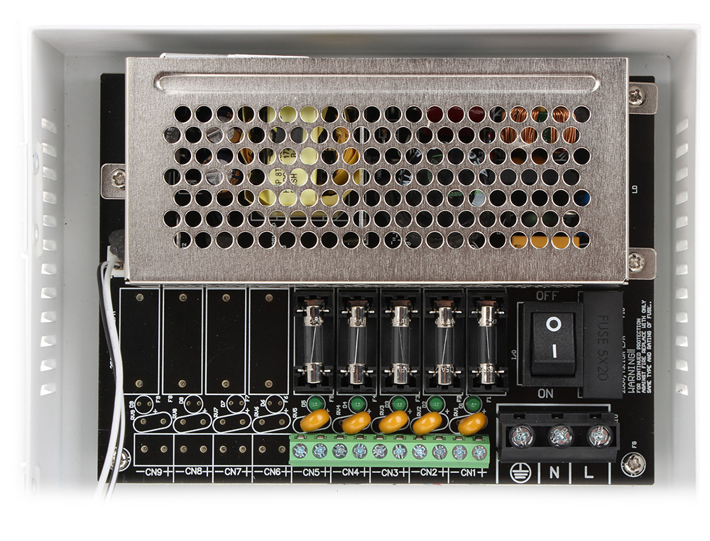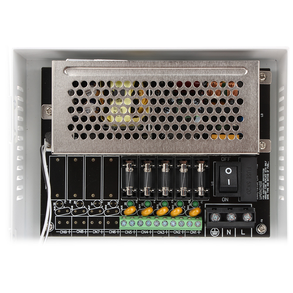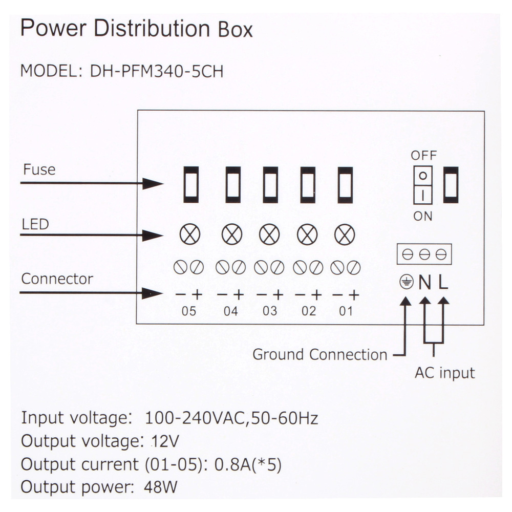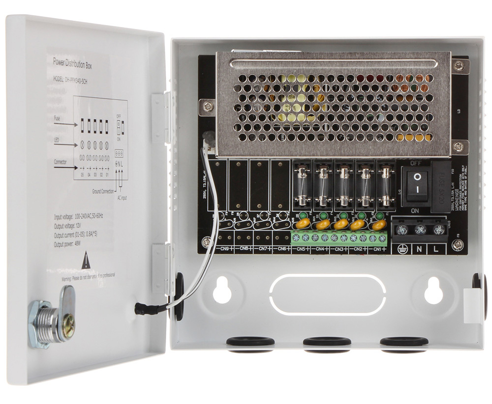 Napojna jedinica 90~260VAc/12VDc 4A; 5 izlaza sa osiguračkom zaštitom; Zaštita od prenapona, kratkog spoja i preopterečenja; LED indikacija prisustva 220V i LED indikacija rada pojedinačnih izlaza; Do 2.5A po izlazu; U metalnom kućištu 165 x 165 x 50 mm; masa 0.85 kg,